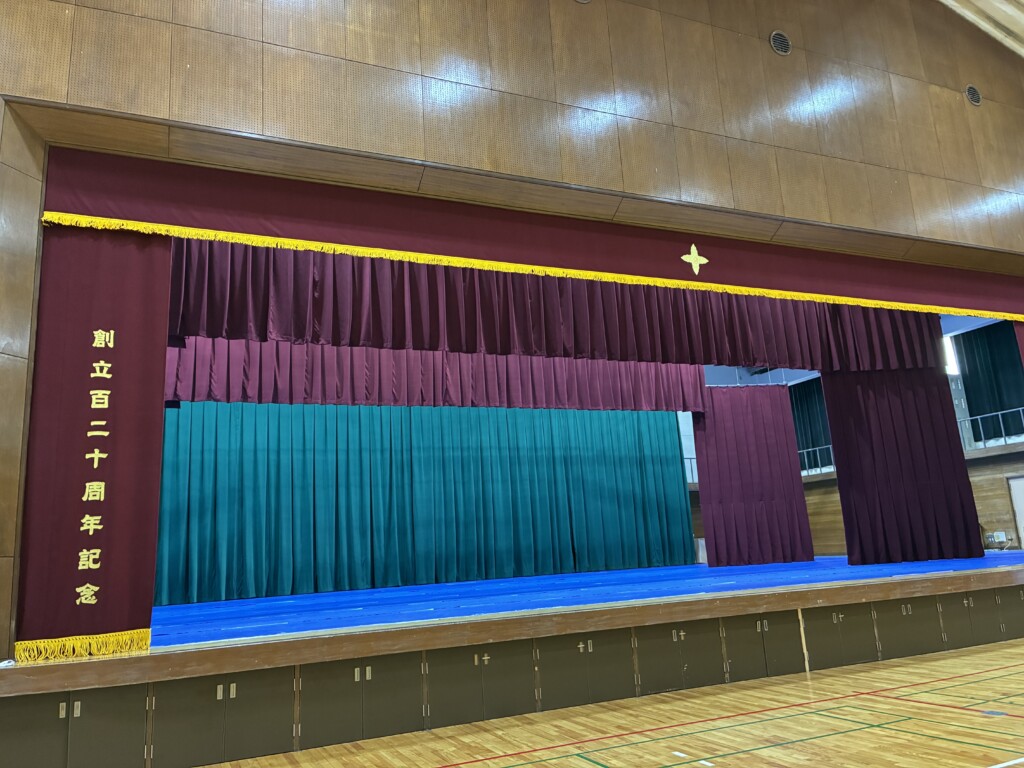 120周年記念事業としてご寄付、またクラウドファンディングでご支援いただき、第二体育館に舞台幕を設置しています。